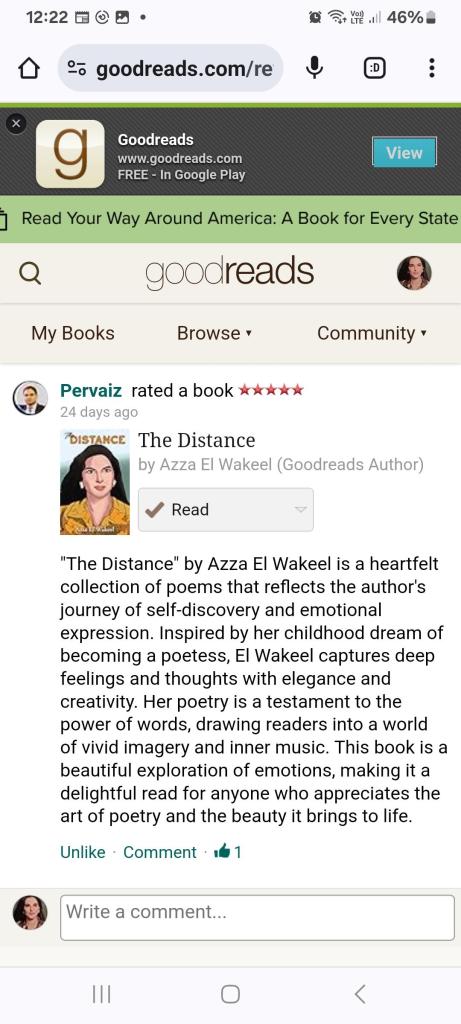 My poetry book “The Distance” received a new fabulous review from Mr. Pervaiz on my goodreads author’s page, he also rated the book 5 stars!.